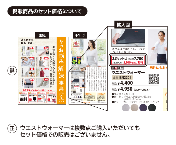 平素より“着る岩盤浴®”BSファイン®をご愛用いただきまして、ありがとうございます。 この度、一部お客様にお送りしております、冬のお悩み解決辞典カタログに、誤表記がございました。皆様にはご迷惑をおかけしましたことを、深くお詫び申し上げます。今後は、一層の社内確認を徹底し、再発防止に努めてまいります。 今後とも変わらぬご愛顧を賜りますよう、心よりお願い申し上げます。